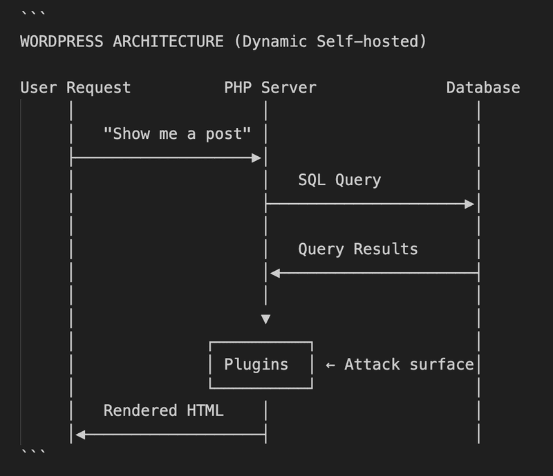 WordPress takes a different architectural approach, but it comes with its own security challenges. As a dynamic, PHP-based CMS, WordPress queries its database on every single page load.