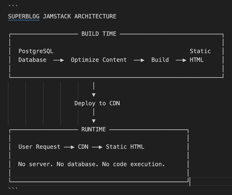 In Jamstack, security is a build-time concern, not a runtime battle. Even if an attacker somehow injected malicious content into your database, it wouldn't affect your live site until the next build — giving you time to detect and respond.