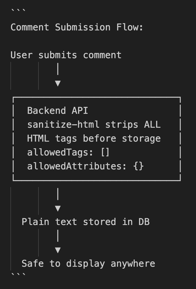 By sanitizing content at the point of entry (the API), not at the point of display, we ensure that malicious content never enters the system in the first place.