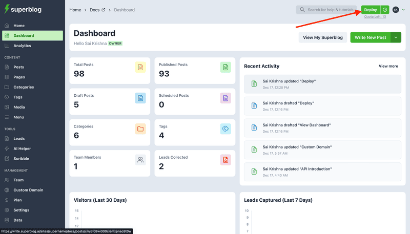Whenever you make any change in your Superblog like updating settings, adding a new post, editing a post, or anything else, you can see that the "Deploy" button is activated. It is seen in the top right of the dashboard.