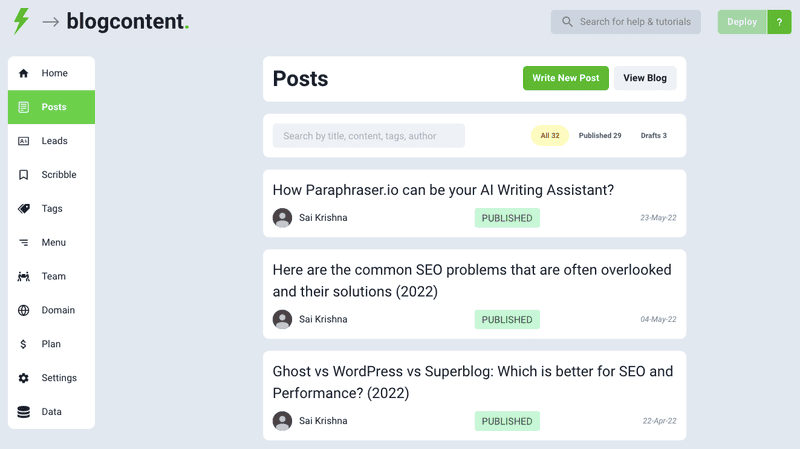 You can import post from .docx, .html, and .md files. This feature is handy if you want to write your blog posts in Google Docs, Notion, or Markdown. Simply export your post as html or docs or markdown format from anywhere and import into superblog in one click.