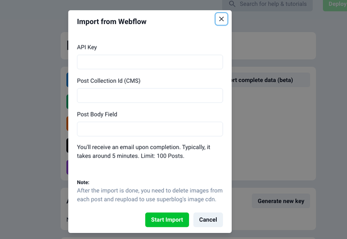 You can import your existing Webflow blog posts to Superblog in less than five minutes with one click.