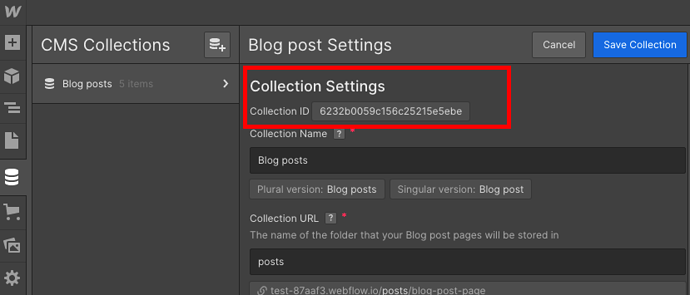 You might have created a CMS collection to create posts on your webflow site. You can visit the CMS section of your webflow site and find the ID in the settings.